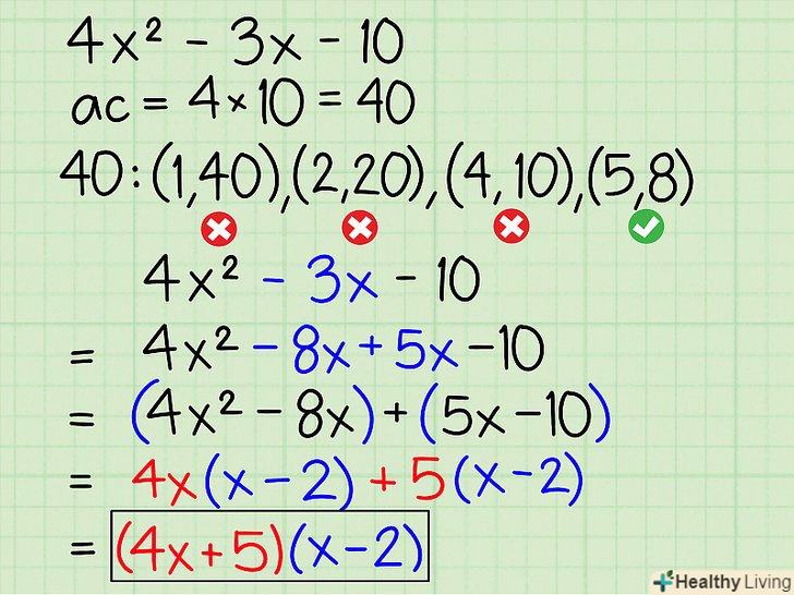 Розкладіть на множники 4x2 - 3x - 10- A * c = 4 * -10 = -40