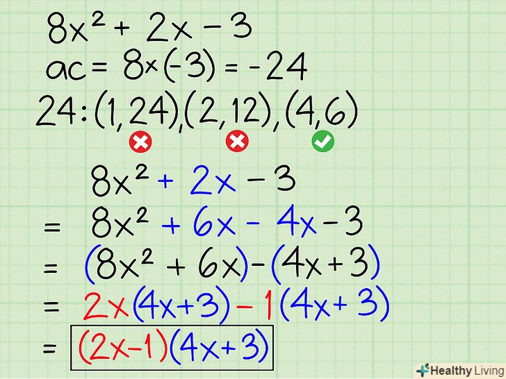 Розкладіть на множники: 8x2 + 2x-3- A * c = 8 * -3 = -24