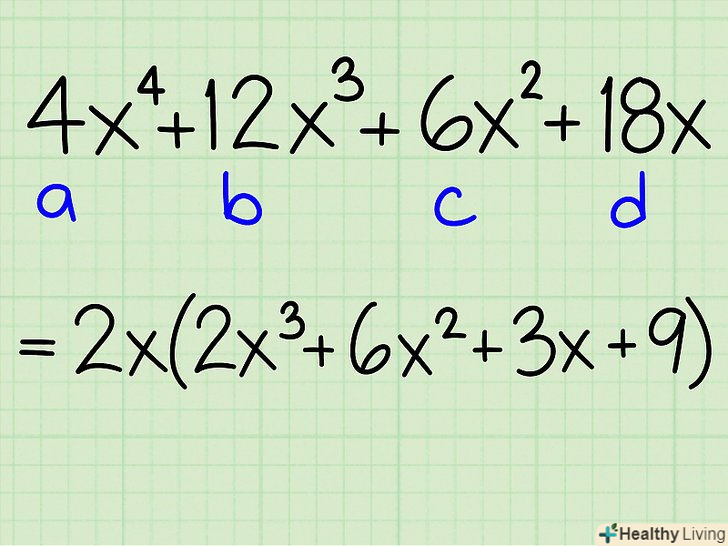 Винесіть за дужки найбільший спільний дільник (НСД). НСД - це найбільше число (вираз), на яке діляться всі члени даного рівняння.- Якщо НСД = 1, за дужки нічого не виносьте.