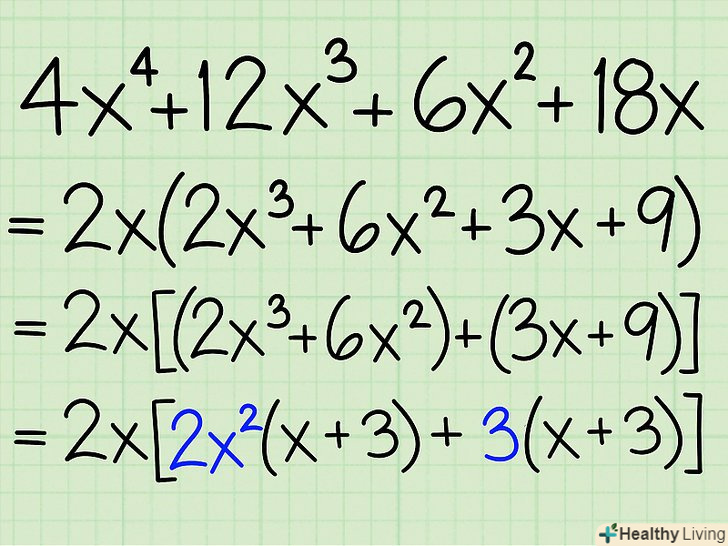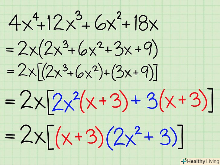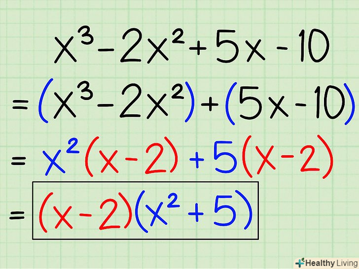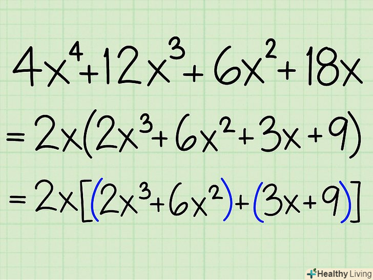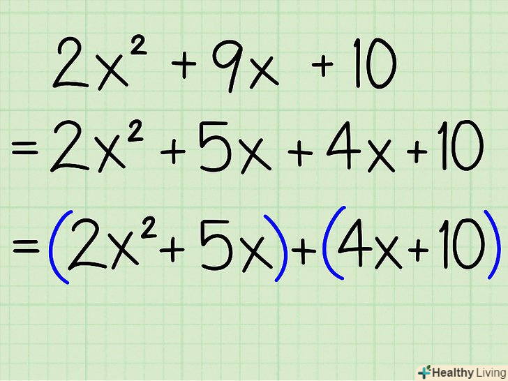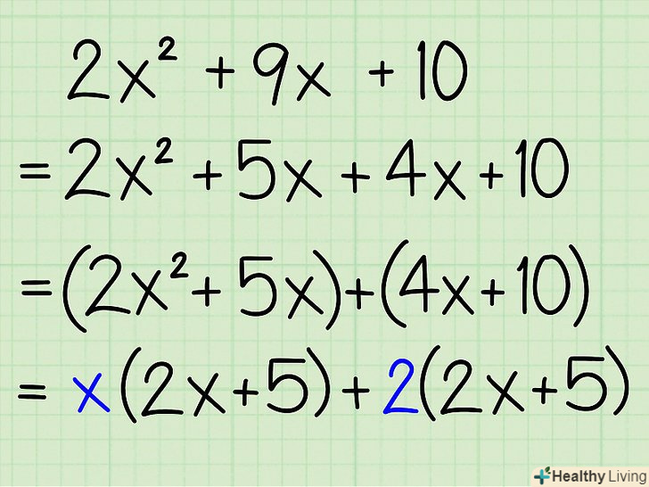 Згрупуйте члени рівняння: розгляньте перші два члени (як пару) і другі два члени (теж як пару).- Приклад: 2x2 + 5x + 4x + 10 = (2x 2 + 5x) +(4x + 10)