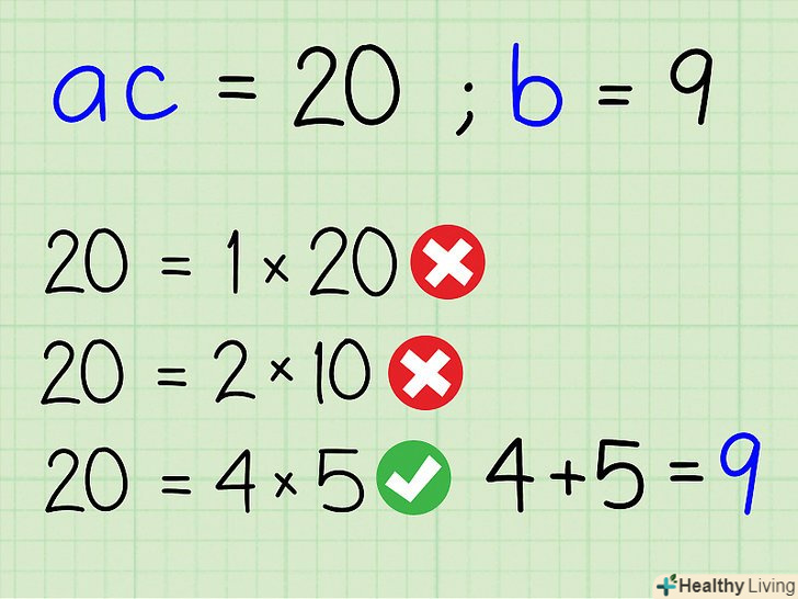 Знайдіть пару множників, сума яких дорівнює коефіцієнту b.- Якщо результат добутку а на С негативний, то знайдіть пару множників, різниця яких дорівнює коефіцієнту b.