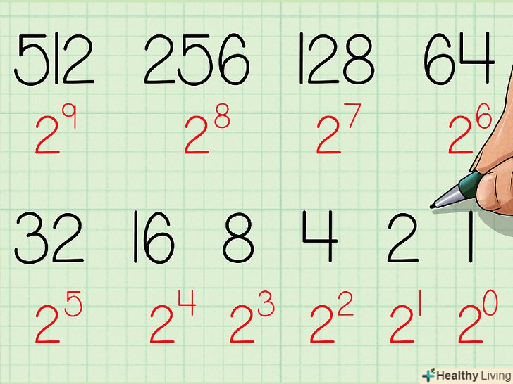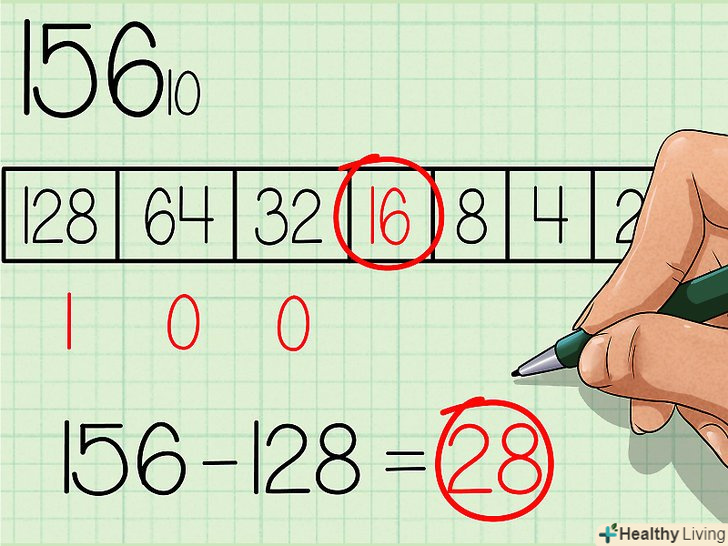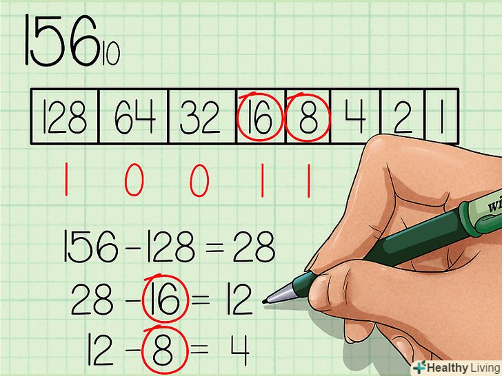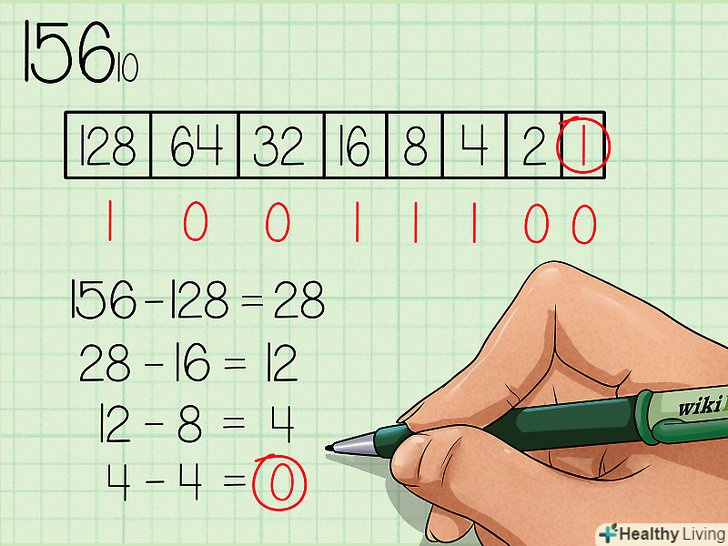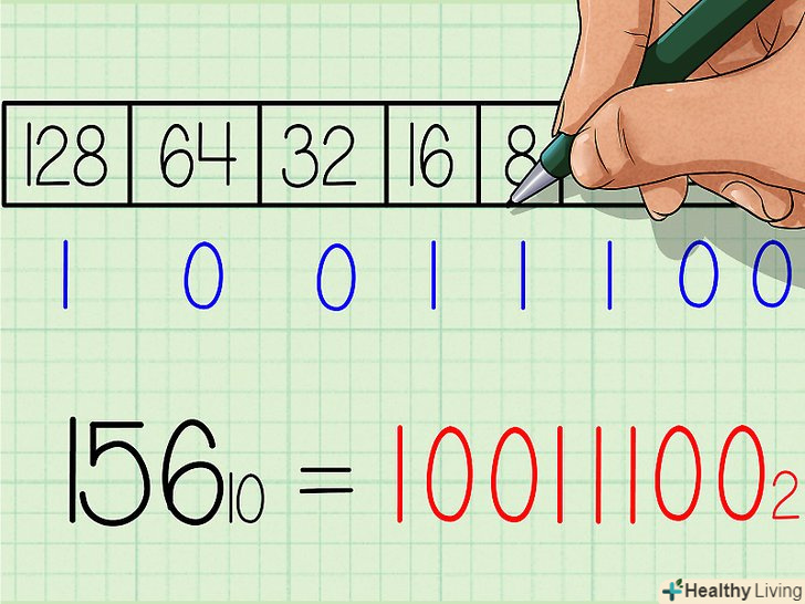 Запишіть вийшло двійкове число. це число буде точно таким же, якою буде послідовність нулів і одиниць в нашій таблиці, якщо читати її зліва направо. У вас повинно було вийти 10011100. Це двійковий еквівалент десяткового числа 156. Або, якщо записувати з базовими індексами: 15610 = 100111002.- Повторюючи цей метод, ви запам'ятаєте ступеня двійки, що дозволить вам пропустити перший крок даного керівництва.