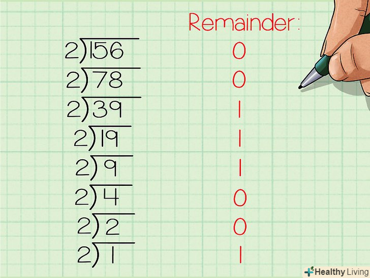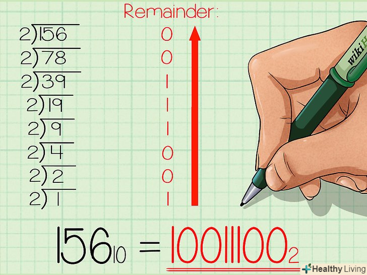 Запишіть нове, бінарне число.Прочитайте послідовність залишків знизу вгору, починаючи з останнього залишку. У нашому прикладі у вас повинно було вийти 10011100. Це двійковий еквівалент десяткового числа 156. Це ж число, записане з базовими індексами, виглядає так: 15610 = 100111002- Цей метод може бути змінений для переведення з десяткової в» будь-яку " систему. Ми використовували дільник 2, так як переводили в двійкову систему. Якби ми хотіли перевести наше число в дев'ятиричну систему, тобто в систему з основою 9, то ділили б на дев'ять, а не на два. В результаті ми б отримали число в бажаній системі.