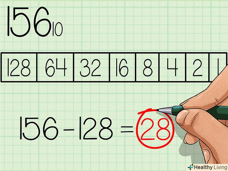 Обчисліть найбільше значення ступеня, що міститься в число, яке ви хочете перевести в двійкову систему.яке найбільше значення ступеня двійки поміститься в 156? Число 128 (2 в сьомому ступені) поміщається, тому самий лівий знак двійкового запису буде 1. Далі вам потрібно відняти 128 з 156, що буде дорівнювати 28.