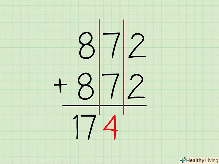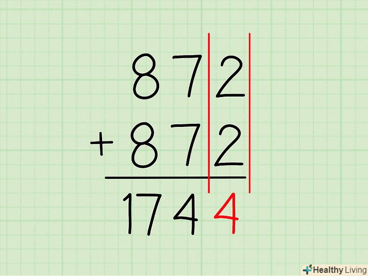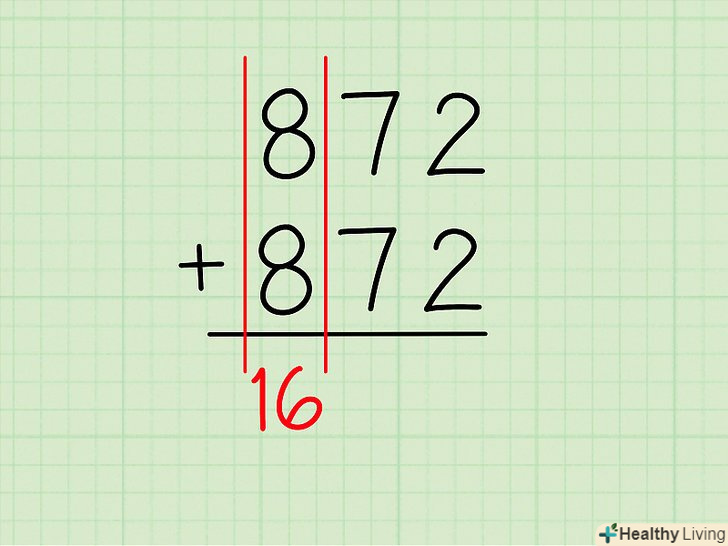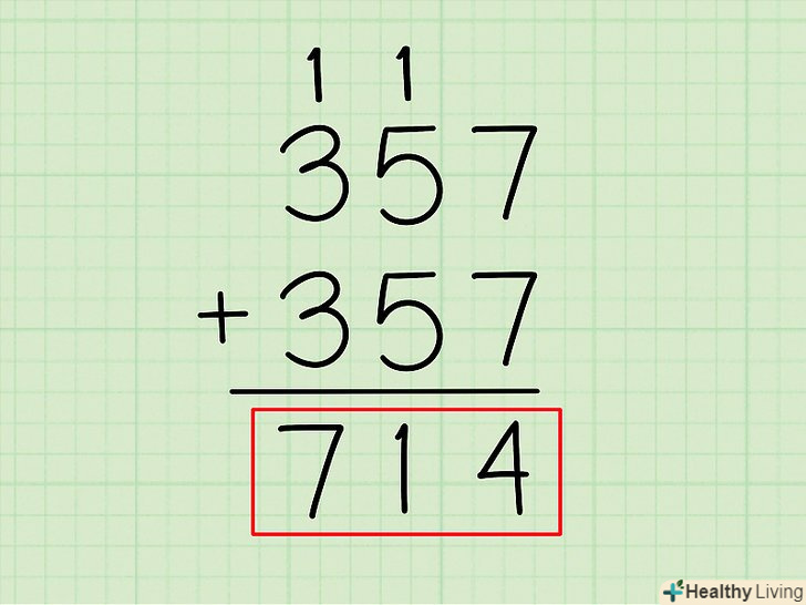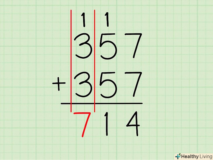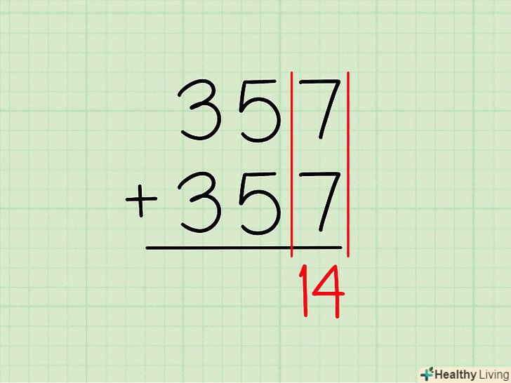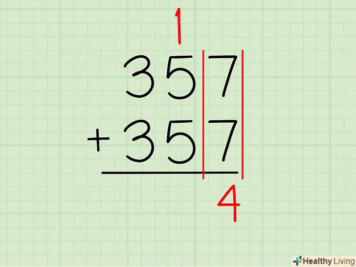 Складіть цифри в правій колонці. Складіть крайні цифри праворуч (одиниці). По суті, Ви просто множите число одиниць на два.- приклад: в 357 + 357 праворуч стоїть7 .