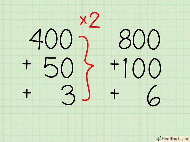 Подвійте кожну частину.Візьміть кожну частину (розряд) і подвійте її окремо.- Щоб подвоїти розряди більше одиниць (тобто десятки, сотні...), помножте на два їх першу цифру, а потім припишіть до результату стільки нулів, скільки їх в множиться числі.
