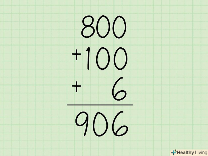 Складіть всі частини.підсумуйте всі результати подвоєння, щоб записати відповідь в стандартному вигляді.- приклад: 800 + 100 + 6 = 906