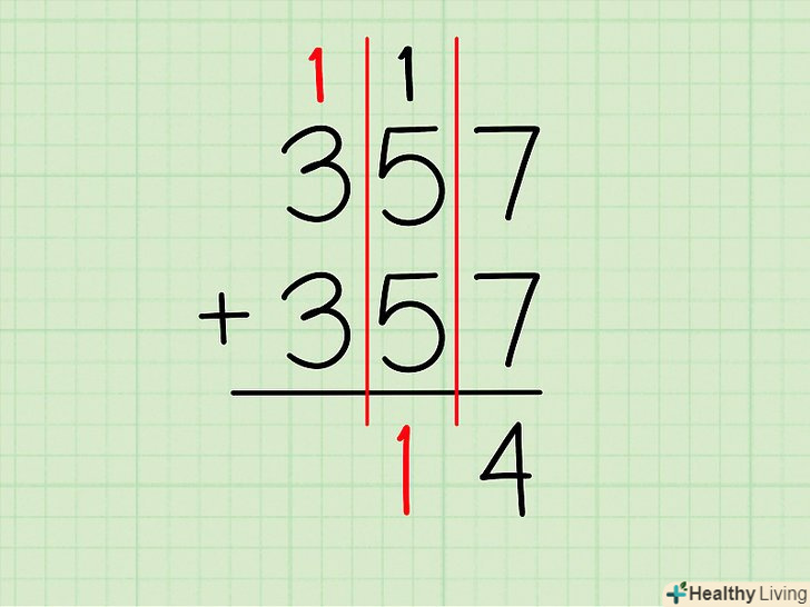 Складіть наступну колонку цифр.складіть цифри в наступній, рахуючи справа наліво, колонці (десятки). Якщо на попередньому кроці ви переносили туди "1", цю одиницю теж потрібно додати до двох інших цифр.- приклад: в 357 + 357 наступною стоїть цифра5 .
