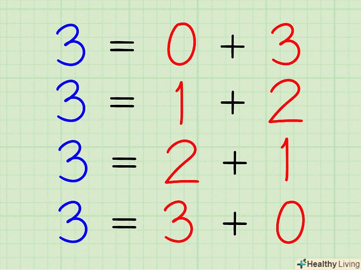 У цьому випадку будь-яке число можна розкласти на різні доданки (числа), які при додаванні дають вихідне число.- Якщо перший доданок відняти з вихідного числа, ви повинні отримати другий доданок.