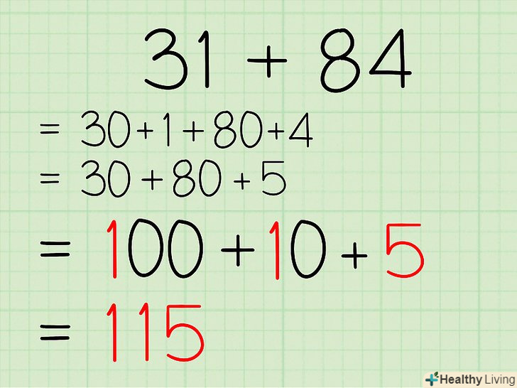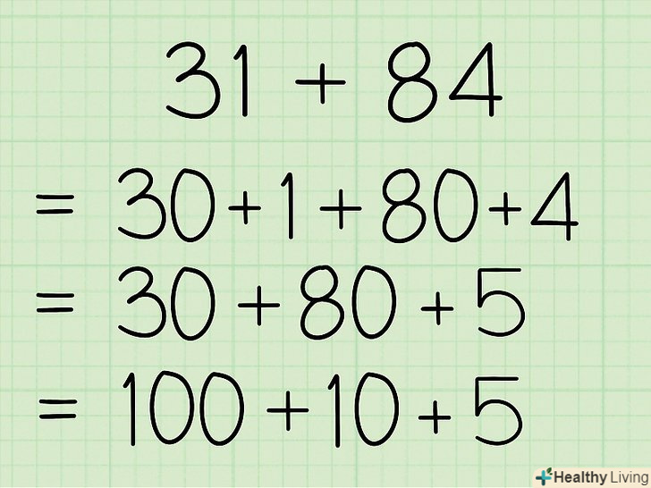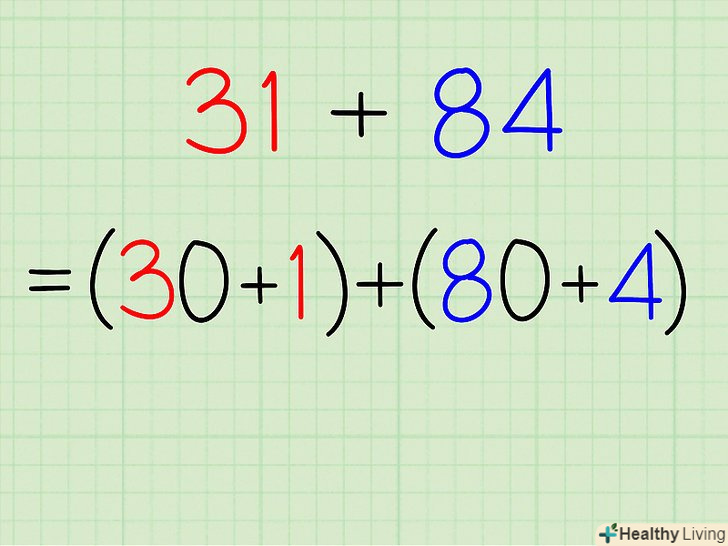 Розкладіть числа в задачі на десятки і одиниці.більш того, ви можете розкласти десятки і одиниці на доданки, щоб ще більше спростити завдання.- Приклад: розкладіть числа і вирішите завдання 31 + 84
