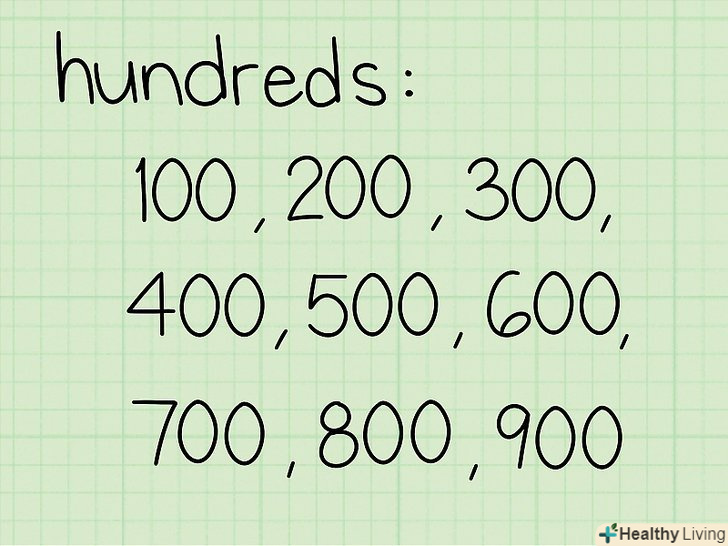 - До цифри, що стоїть в позиції сотень, насправді потрібно приписати два нуля: 100, 200, 300, 400, 500, 600, 700, 800 і 900 (сто, двісті, триста, чотириста, п'ятсот, шістсот, сімсот вісімсот, дев'ятсот).