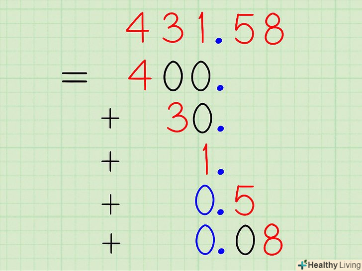 - Запишіть остаточну відповідь: 431,58 = 400 + 30 + 1 + 0,5 + 0,08