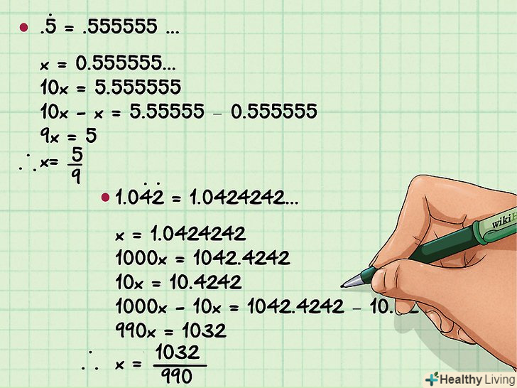 - Для знаходження чисельника (верхнє число) звичайного дробу з отриманої дробу відніміть повторювану групу цифр. У нашому прикладі: 13,131313... – 0,131313... = 13, тобто чисельник дорівнює 13.[6]