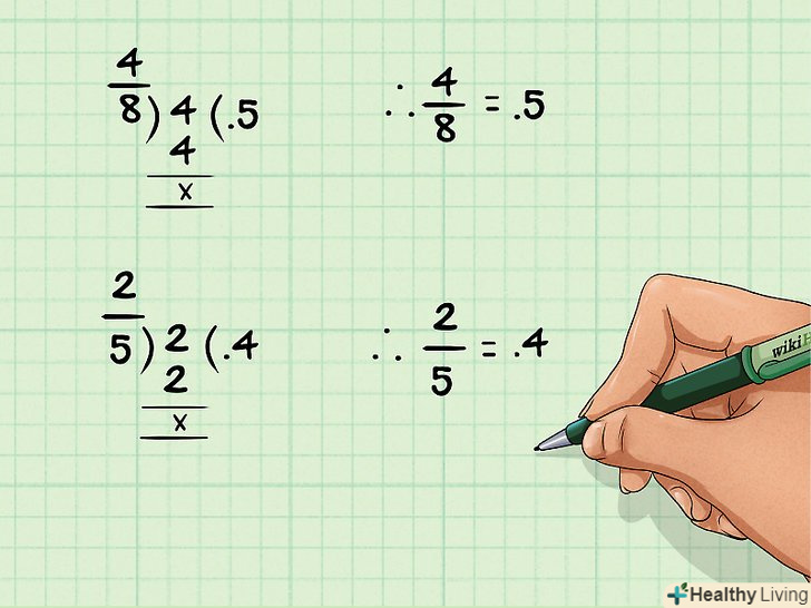 Для перетворення звичайного дробу в десяткову просто розділіть чисельник на знаменник.Пам'ятайте, що риса між чисельником і знаменником означає операцію поділу. Тобто дріб х / у-Це «х», поділений на «у».[7]- Наприклад: дріб 4/8 = 0,5.