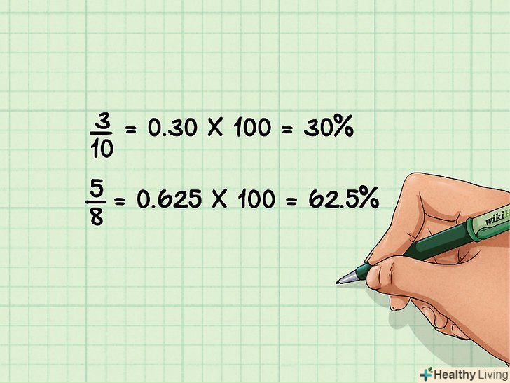 Розділіть чисельник на знаменник, а потім отриманий результат помножте на 100, щоб отримати відсотки. розділіть чисельник звичайного дробу на її знаменник, отриманий результат помножте на 100, до відповіді припишіть знак відсотків ( % ), і ви отримаєте відсотки.[8]- Наприклад, дана дріб 4/8. Розділіть 4 на 8 і отримаєте 0,50. Помножте 0,50 на 100 і отримаєте 50. Припишіть знак відсотків і отримаєте остаточну відповідь: 50%.