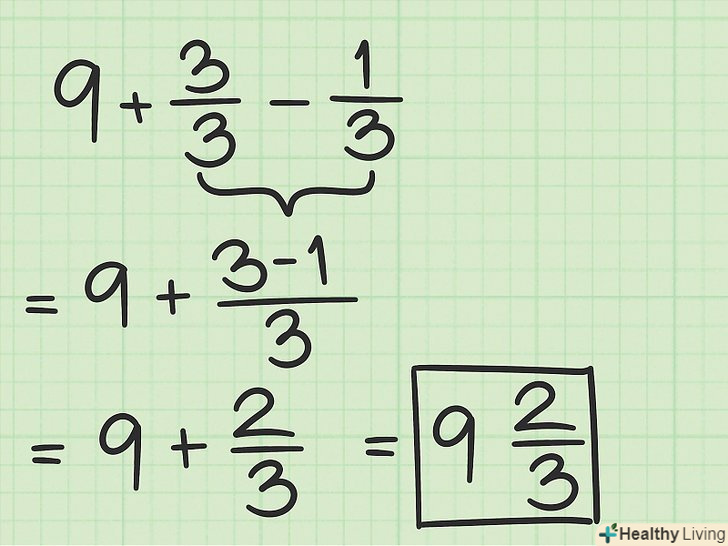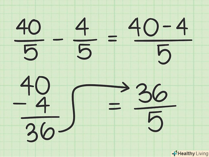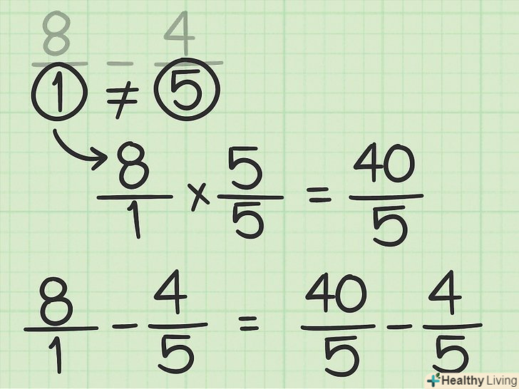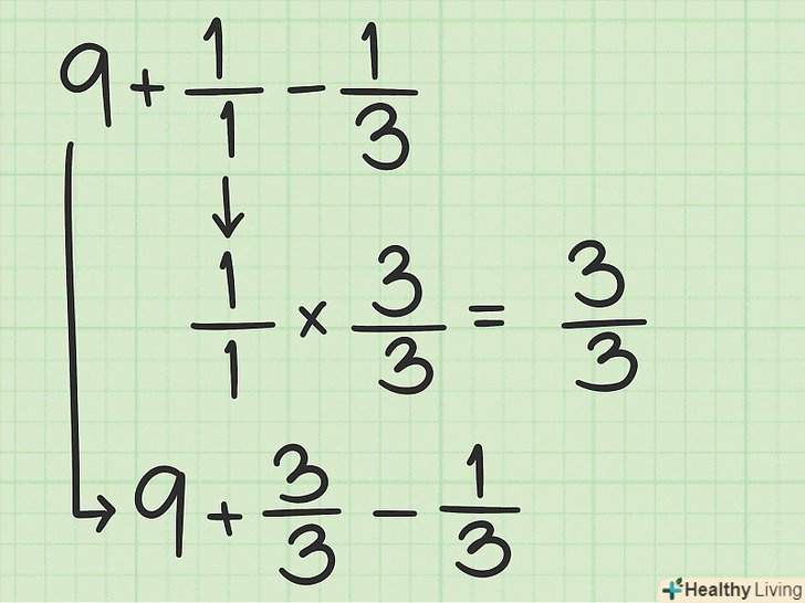 Приведіть дроби до спільного знаменника.знаменник вихідного дробу є найменшим спільним знаменником (НОЗ) обох дробів. Тому помножте на НОЗ чисельник і знаменник нового дробу (яка вийшла з цілого числа) — так ви приведете обидві дроби до спільного знаменника.[2]