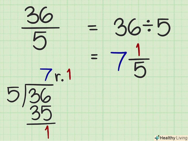 - Розділіть 36 на 5: 36/5 = 7 Ост.1. Таким чином, ціла частина змішаного числа дорівнює 7.