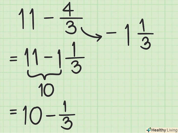 Перетворіть неправильну дріб в змішане число(якщо буде потрібно). якщо в результаті віднімання дробів ви отримали неправильну дріб, можливо, вам доведеться перетворити її в змішане число:[4]- Приклад: Перетворіть