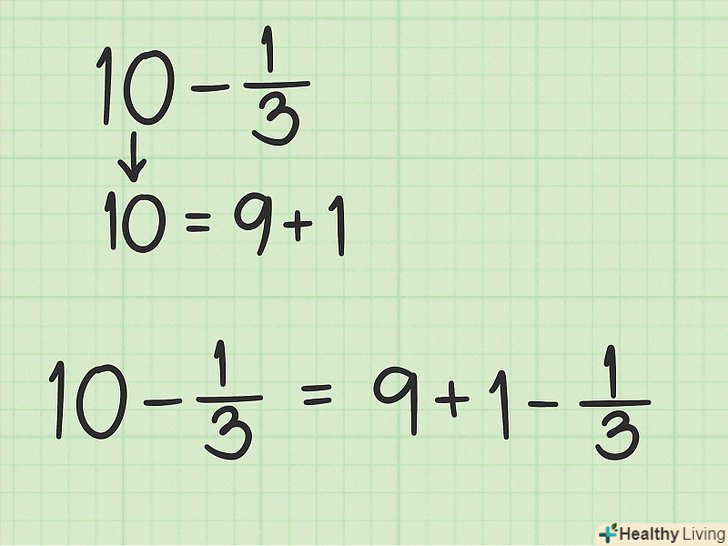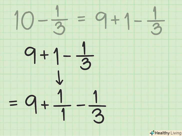 Перетворіть 1 на дріб.для цього скористайтеся діями, описаними в попередньому розділі. Зараз ми покажемо, як вирішити частину виразу «1 - дріб». Інше ціле число залишиться незмінним.