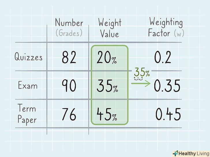 Визначте вагу (або» цінність") кожного числа.наприклад, оцінка за тест становить 20% від фінальної оцінки, оцінка за іспит — 35 %, оцінка за курсову роботу — 45 %. У цьому випадку сума ваг дорівнює 1 (або 100 %).[2]- Щоб використовувати відсотки в обчисленнях, необхідноперетворити їх в десяткові дроби. Отримані числа називаються "ваговими коефіцієнтами".
