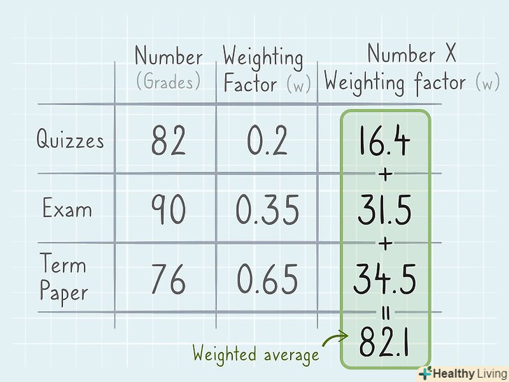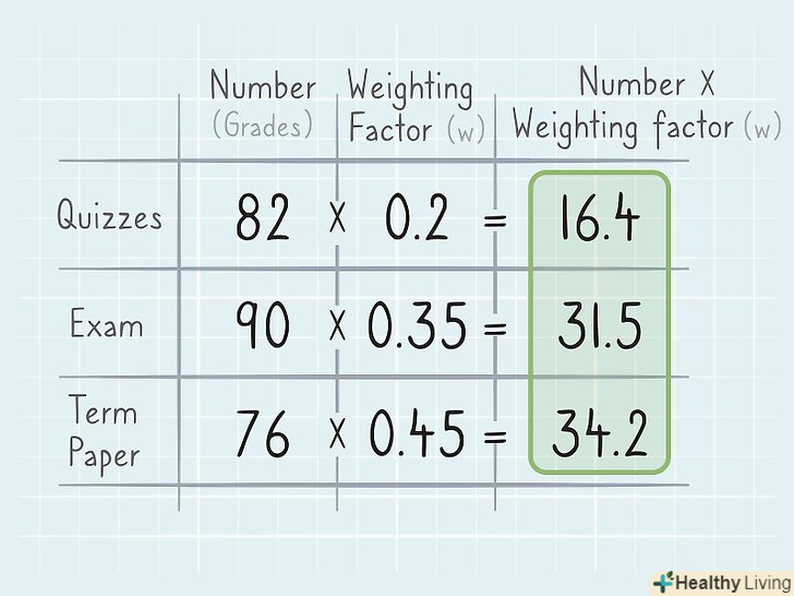 Помножте кожне число (х) на відповідний ваговий коефіцієнт (w).потім складіть отримані значення, щоб обчислити середнє зважене.[3]- Наприклад, якщо за тест ви отримали 82 бали, а оцінка за тест становить 20% від фінальної оцінки, помножте 82 x 0,2. В цьому випадку х = 82 і w = 0,2.