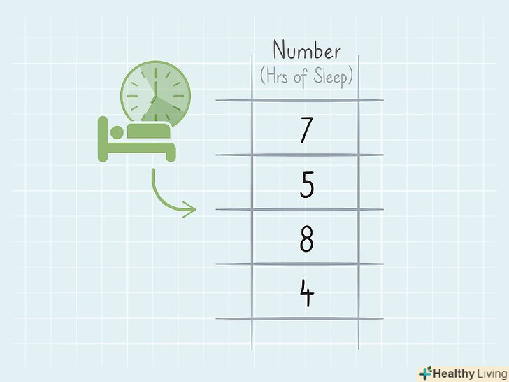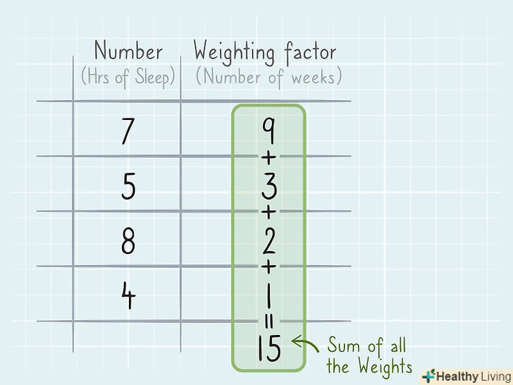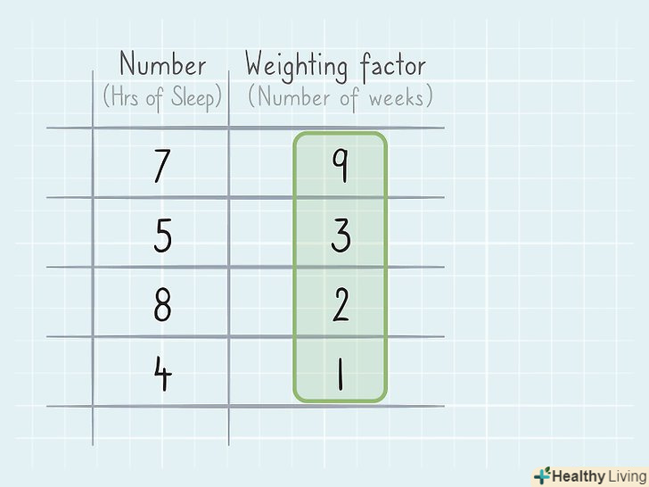 Визначте вагу (або» цінність") кожного числа.наприклад, припустимо, що протягом 15 тижнів було кілька тижнів, коли ви спали довше. Такі тижні мають більшу вагу (тому що ви спали довше, ніж зазвичай). В якості вагового коефіцієнта використовуйте кількість тижнів, пов'язане з середньою тривалістю сну. Наприклад:[6]- 9 тижнів, протягом яких тривалість сну в середньому становила 7 годин на добу.