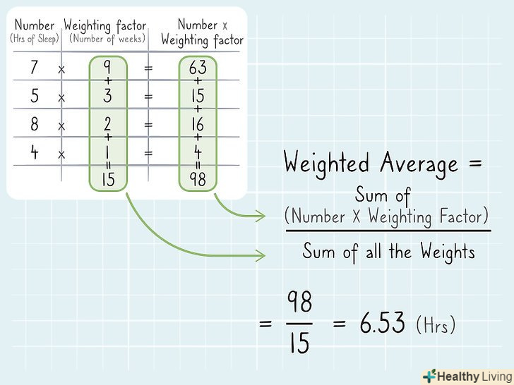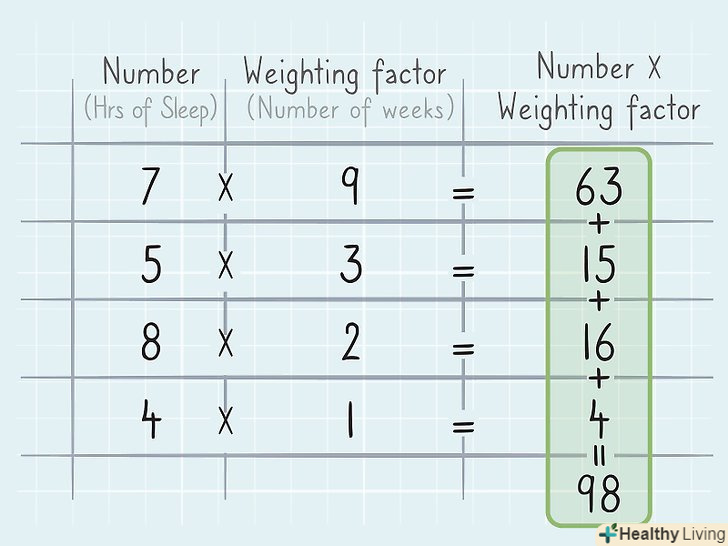Помножте числа на відповідні ваги, а потім складіть результати.у нашому прикладі помножте середню тривалість сну на відповідне число тижнів. Ви отримаєте: [8]- 5(годин на добу)*3(тижні) + 8(годин на добу)*2 (тижні) + 4 (години на добу)*1 (тиждень) + 7 (годин на добу) * 9 (тижнів) = 5(3) + 8(2) + 4( 1) + 7(9) = 15 + 16 + 4 + 63 = 98