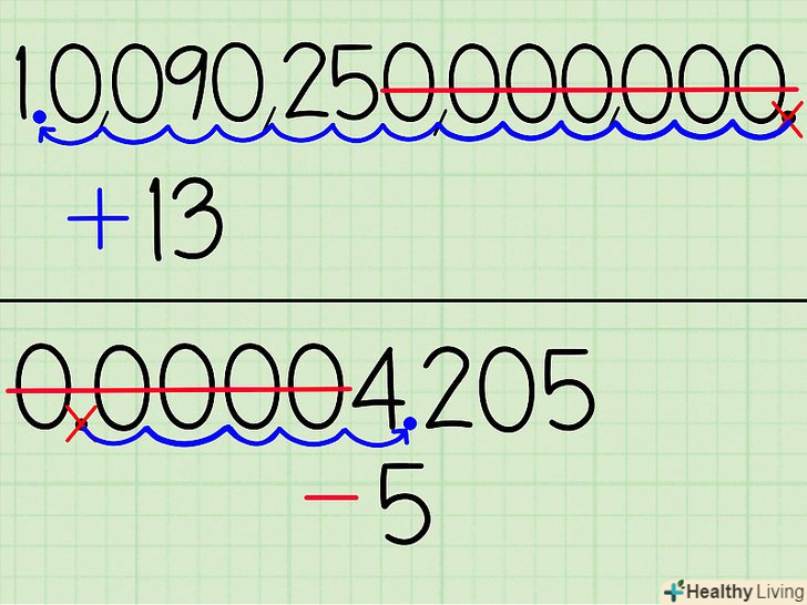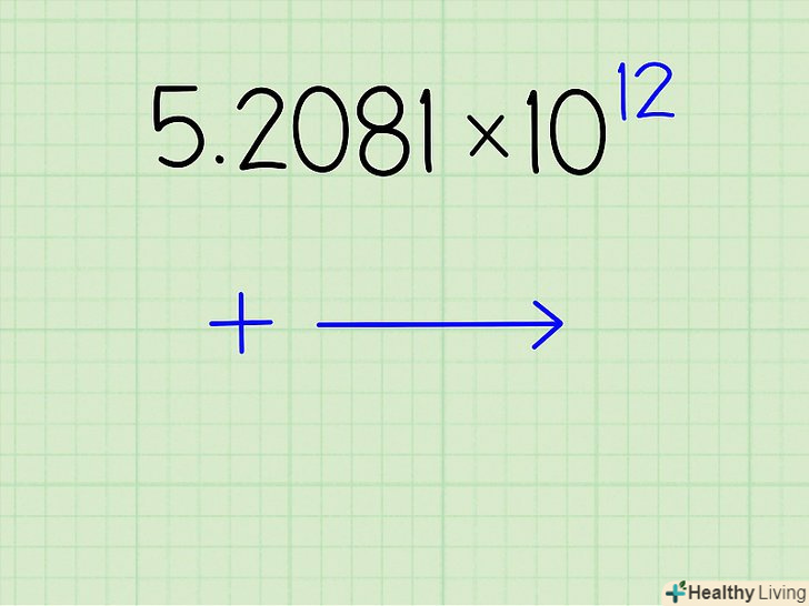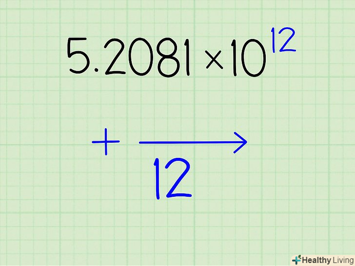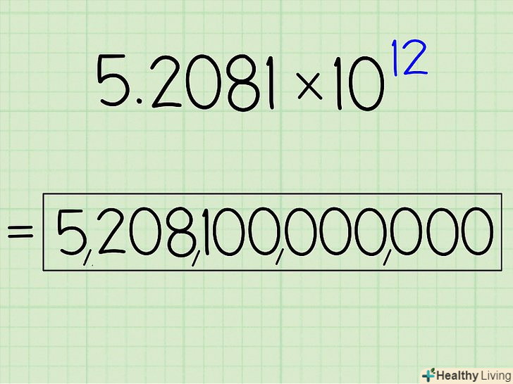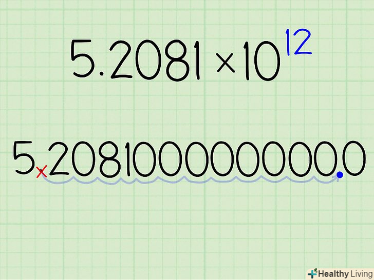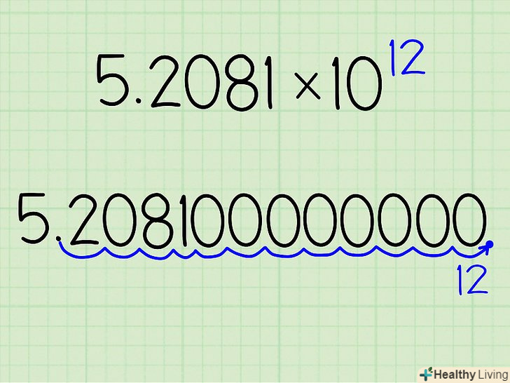 Запишіть, на яку кількість місць вам потрібно пересунути десяткову кому. у числі 5,2081 х1012, наприклад, вам треба буде пересунути десяткову кому на 12 цифр направо. Якщо експонент буде дорівнює -7, треба буде пересунути її на сім цифр наліво, а якщо він дорівнює п'яти, то на п'ять цифр направо.