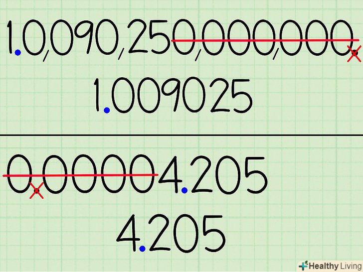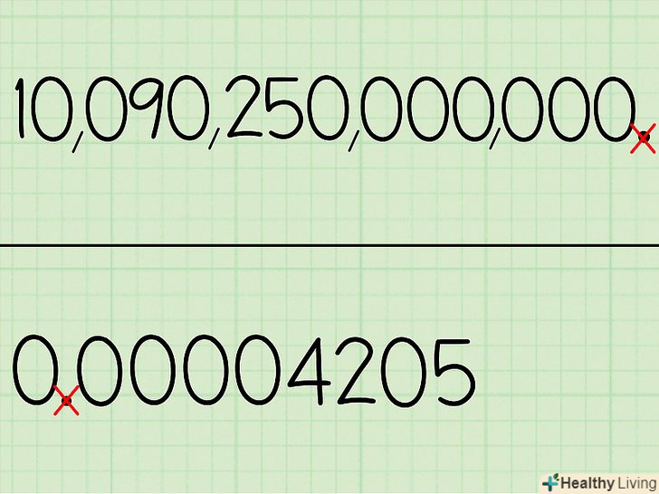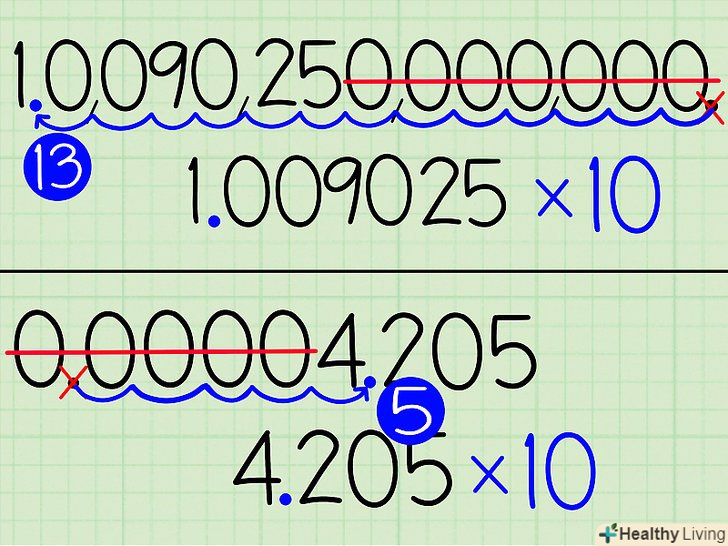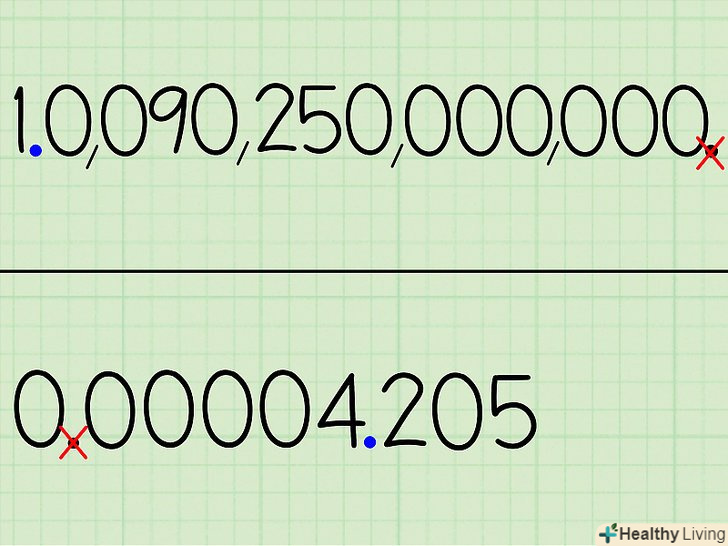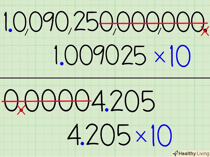 Додайте нову десяткову кому так, щоб перед нею було тільки одне число, не рівне нулю.у нашому випадку перше число, що не дорівнює нулю-це 4, тому поставте кому після нього, щоб вийшло 000004,205.- Великі числа теж можна змінювати подібним чином. При цьому, наприклад, 10,090,250,000,000 перетвориться 1,0090250000000.