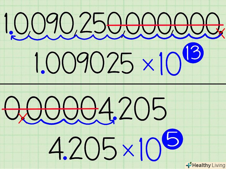 Визначте, позитивним або негативним числом повинен бути експонент.якщо вихідне число було дуже великим, то експонент повинен бути позитивним, а якщо дуже маленьким, то негативним.- Наприклад, дуже велике число 10,090,250,000,000 буде виглядати як 1,009025 х 1013, а дуже маленьке число 0,00004205 перетвориться в 4,205 х 10-5.