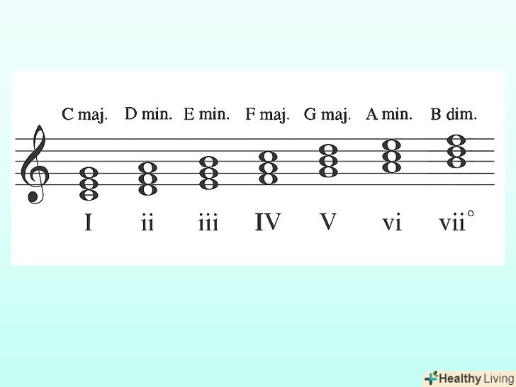 Досліджуйте послідовність акордів, що виходять з основного акорду.[9] клавіші фортепіано вивчені вздовж і впоперек. Були випробувані і вивчені всі можливі комбінації. Теорія може запропонувати найбільш підходящі акорди. Найвідоміша акордова послідовність-I-IV-V-vi (нижній регістр позначає мінорний лад). Римські цифри вказують на номери нот, використовуваних в основному акорді, починаючи від основної ноти тональності. Ці чотири акорди, як було доведено, звучать разом найкраще.- Для початку скористайтеся схемою акордів.[10]