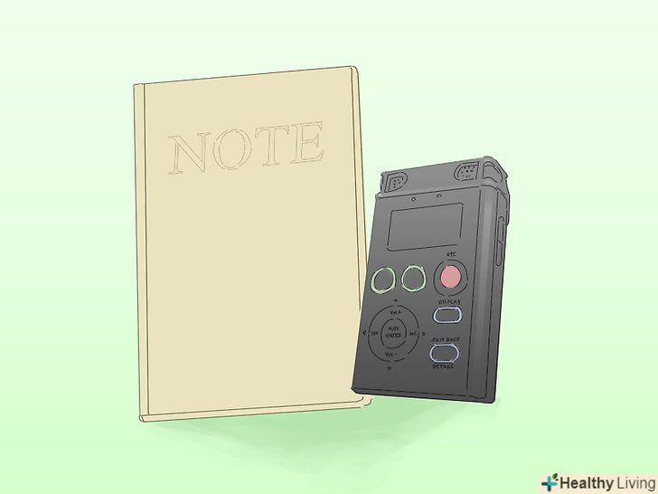 Завжди носіть з собою блокнот і диктофон. [2] ніколи не знаєш, коли на тебе зійде натхнення. На жаль, це часто відбувається в найменш зручний час, наприклад, коли у вас немає доступу до інструменту або ви вже засинаєте. Тому брати з собою всюди блокнот або диктофон-відмінна ідея. Якщо вам прийшла в голову чудова мелодія або ритм, ви можете наспівати її на диктофон, а пізніше адаптувати під піаніно.- Велика частина сучасних телефонів має функцію звукозапису. Якщо у вас немає мобільного пристрою з такою функцією, використовуйте звичайний диктофон.