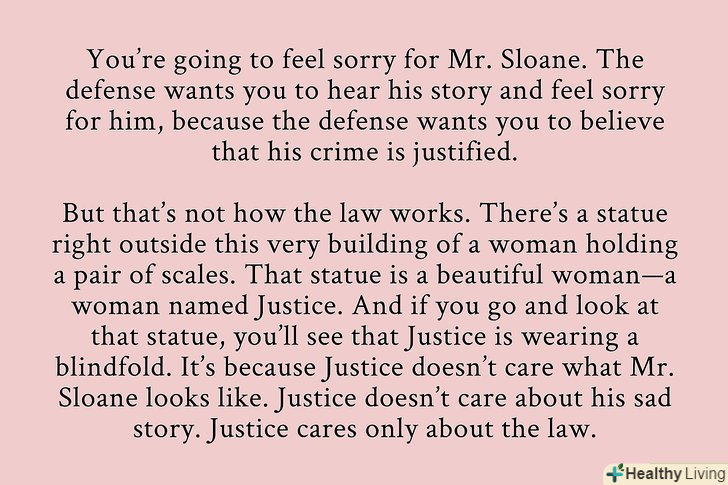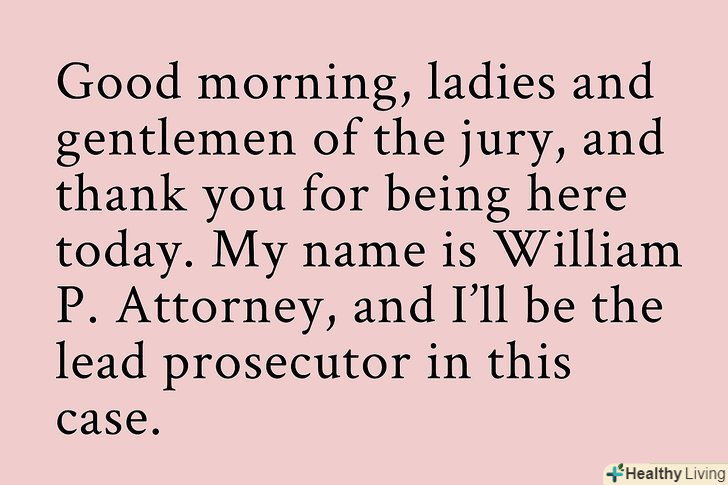 Намагайтеся дотримуватися невимушеного стилю.вступна заява не повинна бути надто суперечливою або авторитарною. Не варто занадто агресивно відстоювати свою точку зору або затівати дискусію. Демонструйте свій професіоналізм, і це допоможе вам домогтися того, що присяжні будуть довіряти вам і вашим словам. Намагайтеся дотримуватися невимушеного стилю.вступна заява не повинна бути надто суперечливою або авторитарною. Не варто занадто агресивно відстоювати свою точку зору або затівати дискусію. Демонструйте свій професіоналізм, і це допоможе вам домогтися того, що присяжні будуть довіряти вам і вашим словам.