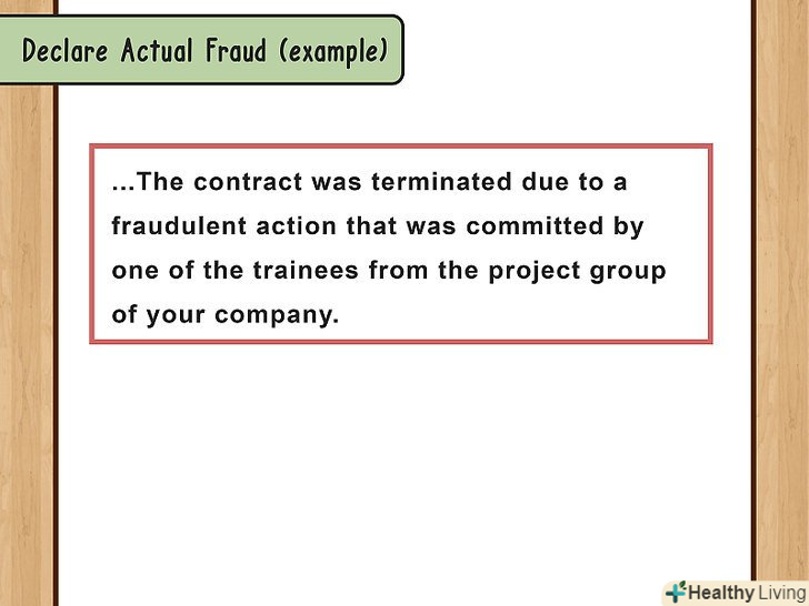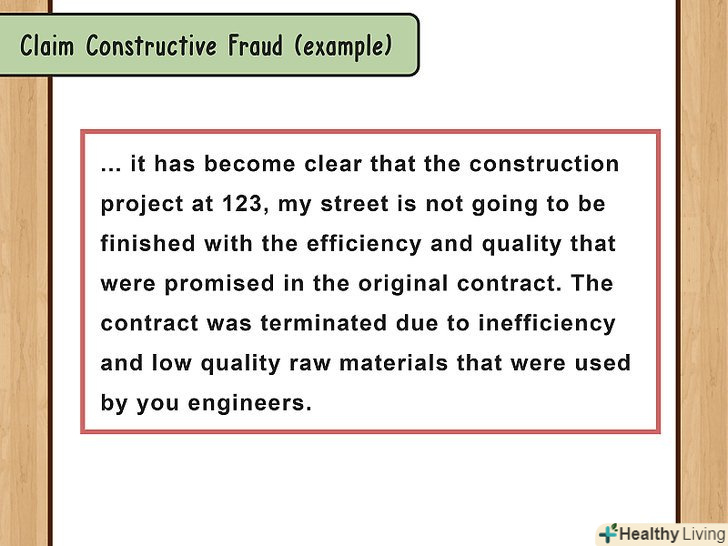 Мається на увазі обман. ви можете анулювати контракт, якщо має місце обман (шахрайство). Є два види обману: мається на увазі обман і фактично досконалий обман. Мається на увазі обман має місце в тому випадку, коли одна сторона робить ненавмисне помилкове заяву про предмет контракту, в результаті чого страждає друга сторона. Мається на увазі обман. ви можете анулювати контракт, якщо має місце обман (шахрайство). Є два види обману: мається на увазі обман і фактично досконалий обман. Мається на увазі обман має місце в тому випадку, коли одна сторона робить ненавмисне помилкове заяву про предмет контракту, в результаті чого страждає друга сторона.- Наприклад, брокер з нерухомості випадково розповідає покупцеві, що будинок набагато більше, ніж він є насправді, а покупець купує будинок через його розмірів. У цьому випадку суд розірве контракт, тому що покупець був введений в оману (брокер зобов'язаний покрити будь-які збитки покупця).