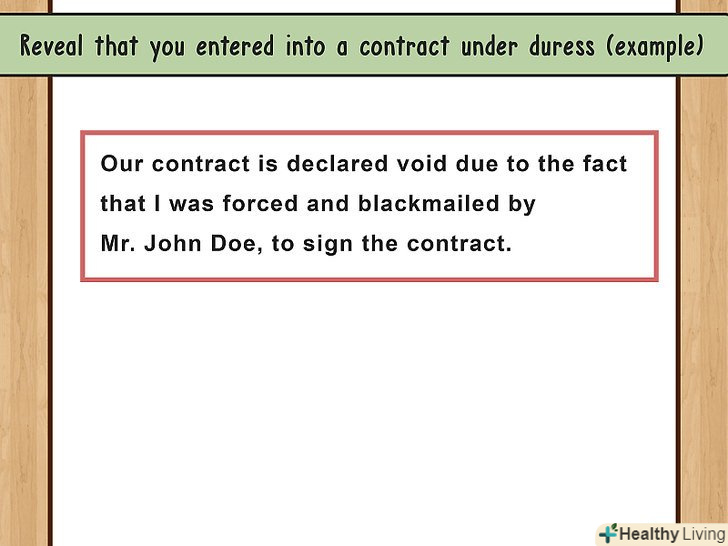 Примус.якщо ви уклали контракт з примусу (під тиском, в результаті шантажу і тому подібного), то такий контракт стає недійсним. Контракт повинен бути укладений з вільної волі обох сторін.[17] Примус.якщо ви уклали контракт з примусу (під тиском, в результаті шантажу і тому подібного), то такий контракт стає недійсним. Контракт повинен бути укладений з вільної волі обох сторін.[17]