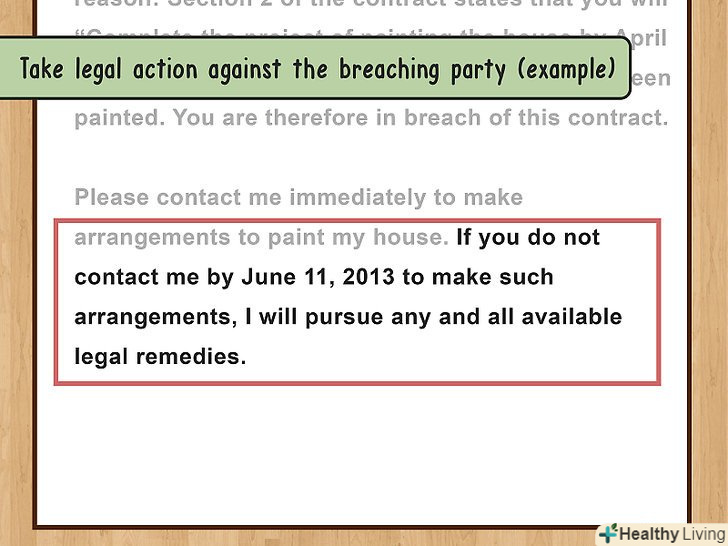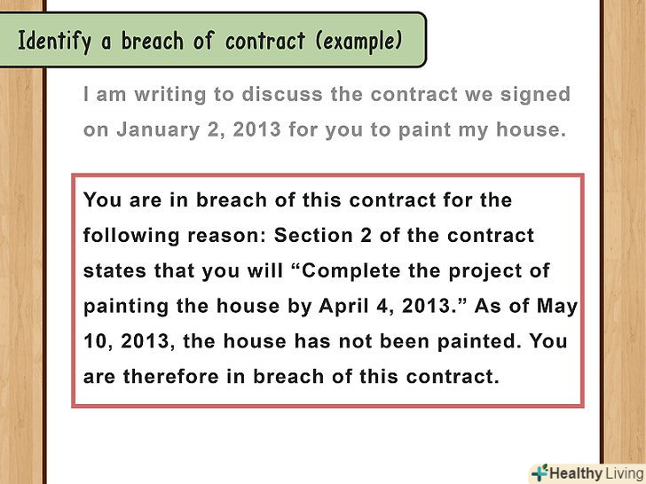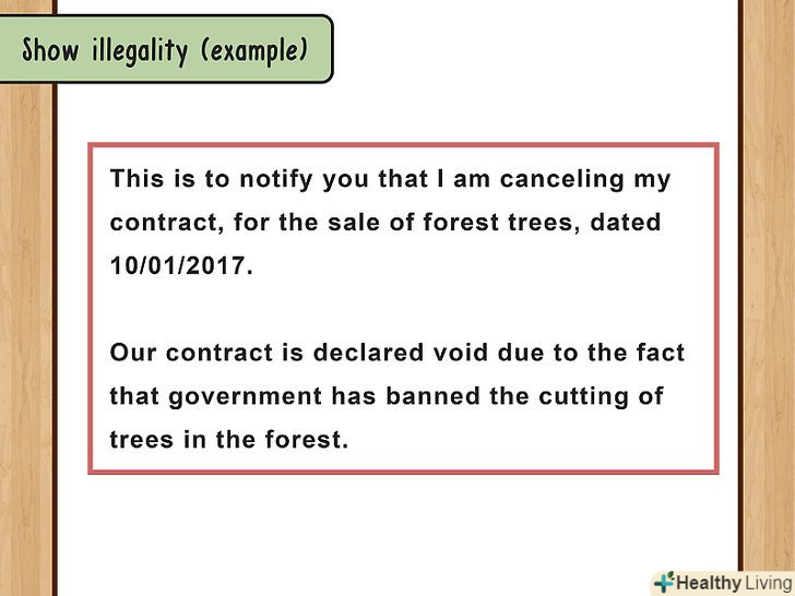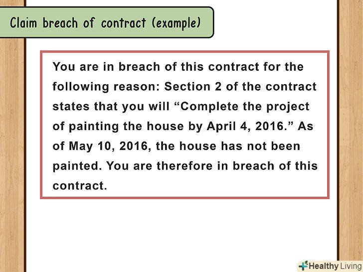 Відмова від виконання зобов'язань.якщо одна сторона не виконує свої зобов'язання, прописані в контракті, то друга сторона має право розірвати такий контракт.[6] Відмова від виконання зобов'язань.якщо одна сторона не виконує свої зобов'язання, прописані в контракті, то друга сторона має право розірвати такий контракт.[6]- Наприклад, якщо ви уклали контракт на фарбування стін, а маляр не виконав своїх зобов'язань (стіни не були пофарбовані), то ви можете розірвати такий контракт, так як його предметом була фарбування стін.