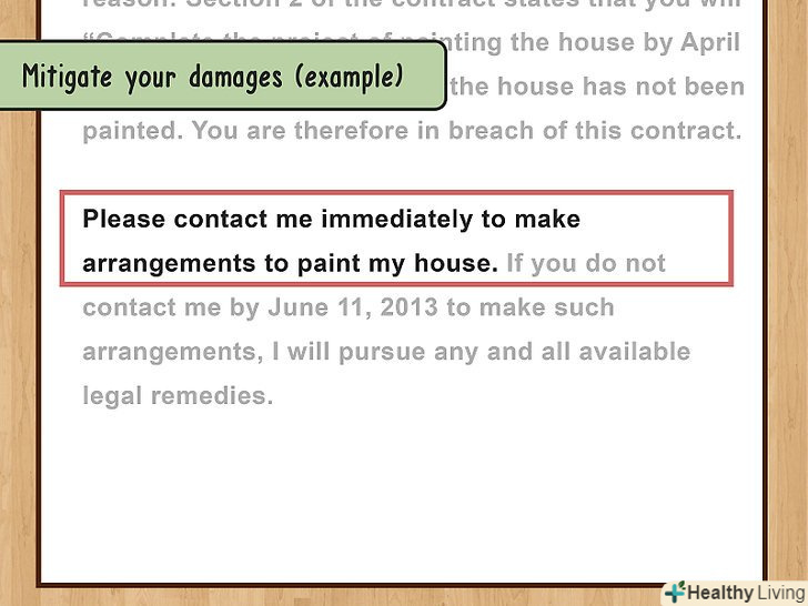 Відшкодування збитку.якщо в результаті невиконання зобов'язань іншою стороною ви зазнали збитків, то ви маєте право на його відшкодування. Якщо ваші витрати на відшкодування збитку менше або дорівнюють сумі контракту, то ви не маєте право на покриття ваших витрат іншою стороною. Якщо ж ваші витрати на відшкодування збитку перевищили суму контракту, то ви маєте право вимагати в іншої сторони покрити різницю між вашими витратами і сумою контракту.[21] Відшкодування збитку.якщо в результаті невиконання зобов'язань іншою стороною ви зазнали збитків, то ви маєте право на його відшкодування. Якщо ваші витрати на відшкодування збитку менше або дорівнюють сумі контракту, то ви не маєте право на покриття ваших витрат іншою стороною. Якщо ж ваші витрати на відшкодування збитку перевищили суму контракту, то ви маєте право вимагати в іншої сторони покрити різницю між вашими витратами і сумою контракту.[21]- Знайдіть спосіб відшкодувати збиток якомога швидше, щоб довести суду, що ви зробили все можливе, щоб уникнути непрямого збитку або додаткових витрат через вашу нерозторопність.[22]