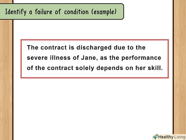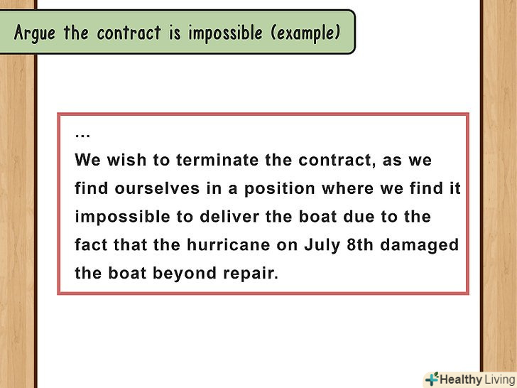 Нездійсненність зобов'язань.якщо з якої-небудь причини ви не можете виконати ваші зобов'язання, то у вас є законне право на розірвання контракту. При цьому такою причиною не можуть бути ваші дії – причинами для розірвання контракту можуть служити дії інших людей або стихійне лихо.[2][3] Нездійсненність зобов'язань.якщо з якої-небудь причини ви не можете виконати ваші зобов'язання, то у вас є законне право на розірвання контракту. При цьому такою причиною не можуть бути ваші дії – причинами для розірвання контракту можуть служити дії інших людей або стихійне лихо.[2][3]- Наприклад, розглянемо договір про продаж човна. У разі якщо ураган знищив човен без можливості його відновлення в ніч, що передує дню продажу, такий договір може бути розірваний.[4]