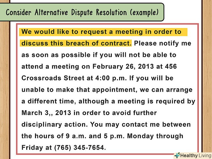 Альтернативне вирішення конфліктної ситуації.якщо має місце порушення контракту, то ви можете врегулювати спори альтернативним рішенням. У цьому випадку сторони контракту ділять витрати на найм посередника. Ця людина допоможе вам знайти взаємоприйнятне рішення. Процес альтернативного вирішення конфліктної ситуації включає в себе її оцінку нейтральною третьою стороною (людиною, яка не є юристом). Він також включає в себе переговори і посередництво.[23] Альтернативне вирішення конфліктної ситуації.якщо має місце порушення контракту, то ви можете врегулювати спори альтернативним рішенням. У цьому випадку сторони контракту ділять витрати на найм посередника. Ця людина допоможе вам знайти взаємоприйнятне рішення. Процес альтернативного вирішення конфліктної ситуації включає в себе її оцінку нейтральною третьою стороною (людиною, яка не є юристом). Він також включає в себе переговори і посередництво.[23]