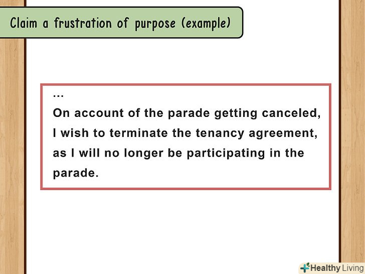 Недосяжність мети контракту.якщо мета контракту з якої-небудь причини стає недосяжною, то ви можете розірвати такий контракт, але при цьому мета контракту повинна бути добре відома обом сторонам, які уклали контракт.[5] Недосяжність мети контракту.якщо мета контракту з якої-небудь причини стає недосяжною, то ви можете розірвати такий контракт, але при цьому мета контракту повинна бути добре відома обом сторонам, які уклали контракт.[5]- Наприклад, якщо ви орендуєте деяке приміщення з метою брати участь в параді, але парад скасований, ви можете розірвати контракт оренди (тільки якщо інша сторона знала, що ви орендуєте приміщення виключно з метою участі в параді).