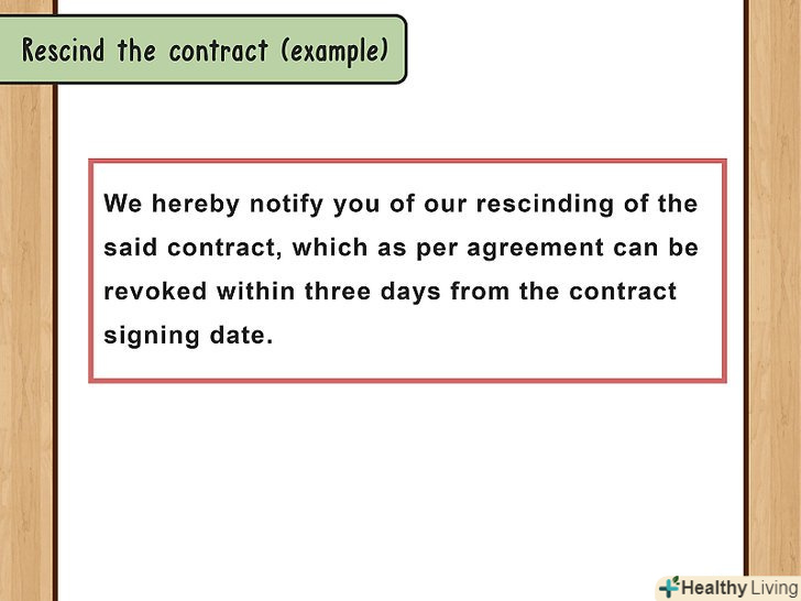 У разі відсутності в контракті пункту про анулювання контракту перевірте за допомогою юриста законодавство про припинення контрактів.деякі федеральні і місцеві закони дозволяють анулювання певних контрактів в зазначені терміни, як правило, від 3 днів з моменту укладення контракту. У разі відсутності в контракті пункту про анулювання контракту перевірте за допомогою юриста законодавство про припинення контрактів.деякі федеральні і місцеві закони дозволяють анулювання певних контрактів в зазначені терміни, як правило, від 3 днів з моменту укладення контракту.- Наприклад, Положення Z Федерального закону "про достовірність інформації в кредитуванні" дає право на скасування певних виплат (коли будинок використовується в якості застави) до півночі третього робочого дня з моменту підписання контракту. Федеральний закон також дозволяє протягом 3 днів анулювати контракт на покупку товарів або послуг загальною вартістю $25 і більше, укладений з комівояжером.[11][12][13]