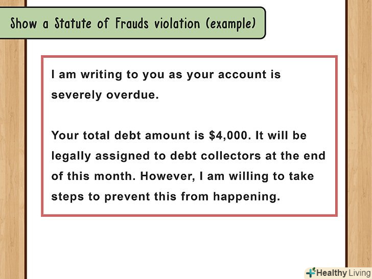 Обман з правової презумпції.правова презумпція передбачає, що деякі контракти повинні бути укладені в письмовій формі, щоб мати юридичну силу. Такими контрактами є контракти з продажу товарів на суму, що перевищує $500; з продажу землі або нерухомості; з оплати боргів іншої людини; шлюбний контракт; довгостроковий контракт (укладається на термін більше одного року).[10] якщо ви уклали усний договір по одній з перерахованих вище угод, то ви можете анулювати такий договір, так як він не був укладений в письмовій формі. Обман з правової презумпції.правова презумпція передбачає, що деякі контракти повинні бути укладені в письмовій формі, щоб мати юридичну силу. Такими контрактами є контракти з продажу товарів на суму, що перевищує $500; з продажу землі або нерухомості; з оплати боргів іншої людини; шлюбний контракт; довгостроковий контракт (укладається на термін більше одного року).[10] якщо ви уклали усний договір по одній з перерахованих вище угод, то ви можете анулювати такий договір, так як він не був укладений в письмовій формі.