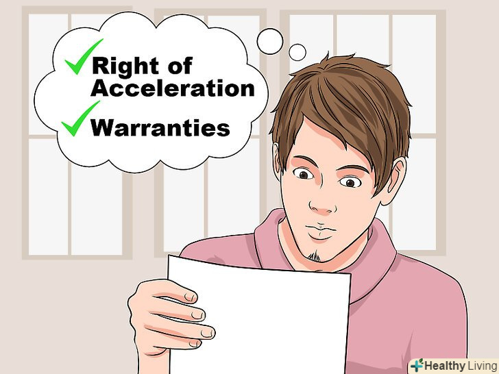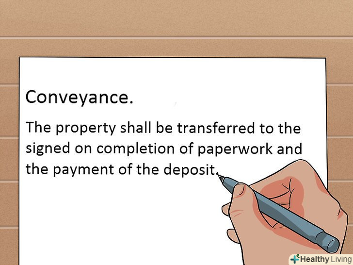 Уточніть наявність інших обов'язкових умов відповідно до законодавства вашої країни.закони, що регулюють порядок укладання договорів про придбання нерухомості в розстрочку або договорів на продаж землі, варіюються від країни до країни. Вивчіть місцеве законодавство або проконсультуйтеся з юристом, що спеціалізується на угодах з нерухомістю, щоб виявити такі додаткові вимоги. Обов'язкові відповідно до місцевого законодавства умови або пункти можуть передбачати наступне: Уточніть наявність інших обов'язкових умов відповідно до законодавства вашої країни.закони, що регулюють порядок укладання договорів про придбання нерухомості в розстрочку або договорів на продаж землі, варіюються від країни до країни. Вивчіть місцеве законодавство або проконсультуйтеся з юристом, що спеціалізується на угодах з нерухомістю, щоб виявити такі додаткові вимоги. Обов'язкові відповідно до місцевого законодавства умови або пункти можуть передбачати наступне:- Право дострокового стягнення. Право дострокового стягнення - це право продавця на стягнення всієї суми кредиту в разі порушення Покупцем умов оплати або інших умов договору.[21]