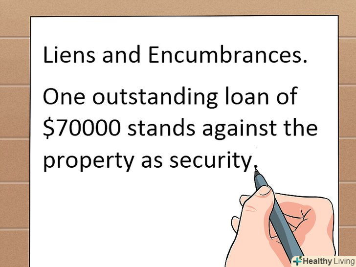 Позначте будь-які існуючі права застави або інші подібні права третіх осіб на майно.оскільки зобов'язання з майновим забезпеченням передбачають зацікавленість третьої сторони в майні або обмежують інтерес покупця, останній має право на повне розкриття такої інформації. Позначте будь-які існуючі права застави або інші подібні права третіх осіб на майно.оскільки зобов'язання з майновим забезпеченням передбачають зацікавленість третьої сторони в майні або обмежують інтерес покупця, останній має право на повне розкриття такої інформації.- Права третіх осіб можуть включати в себе іпотеку або інші види кредитів, де нерухомість була використана в якості забезпечення. Сюди також входить невиконане рішення суду, відповідно до якого майно було описано.[9]