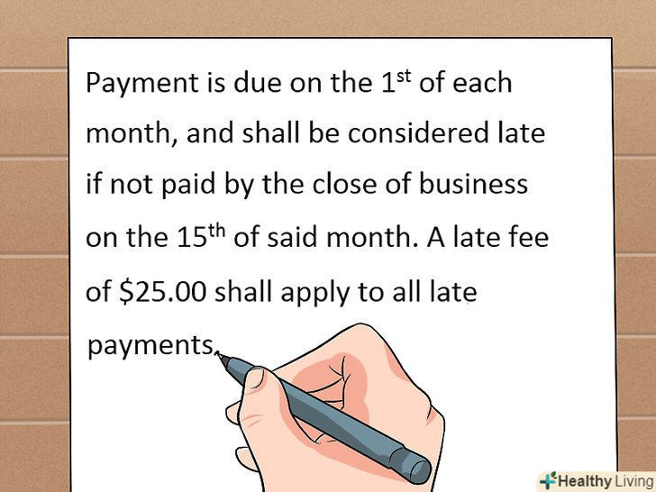 - Прострочені платежі. Вкажіть в яких випадках щомісячні внески будуть вважатися простроченими і застосовуваний штраф за прострочення. Наприклад: "Оплата повинна бути проведена 1-го числа кожного місяця; платіж вважається простроченим, якщо не буде здійснено до кінця робочого дня 15-числа зазначеного місяця. Штраф у розмірі 25.00 доларів США буде застосовуватися до всіх прострочених платежів".[14]