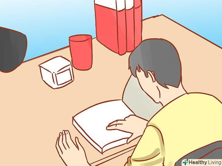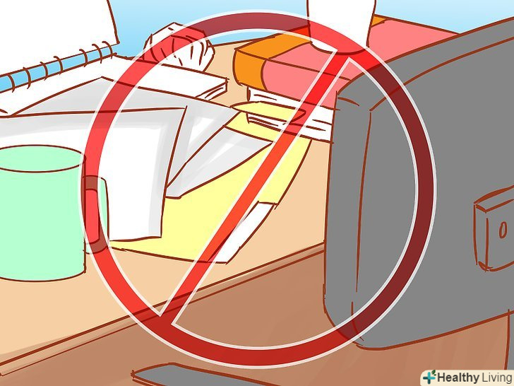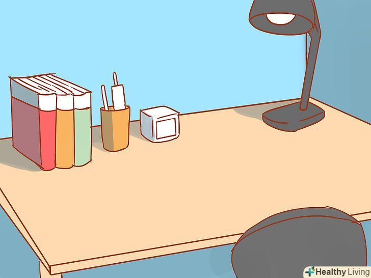 Позбавтеся від безладу на столі.це означає правильну організацію не тільки зберігання, але і самого навчального процесу: стежте, щоб зошити, папери, ручки, відкриті книги не надто захаращували стіл, поки ви займаєтеся. Безлад може викликати стрес і відчуття втоми і загальмувати навчання.[11]- Так як в будь-якому випадку вам варто влаштовувати перерви в заняттях, улучайте під час них момент, щоб прибратися на робочому місці, перед тим як продовжити.
