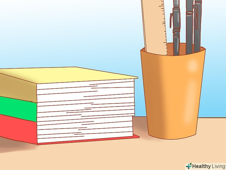 Підготуйте навчальні приналежності.переконайтеся, що у вас під рукою є все необхідне, і вам не доведеться втрачати час, риючись в столі або шафі в пошуках лінійки або запасних стрижнів для олівця.[6]- Класичне шкільне приладдя-ручки, олівці, ластики, зошити, Папір для нотаток, маркери тощо — зберігайте у відведеному місці на столі або у висувному ящику.
