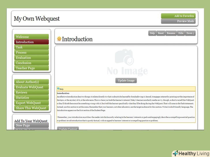 Зробіть сторінку-введення. введення дозволить вам... як Ви вже самі здогадалися, ввести своїх студентів в курс Завдання. У вступі зазвичай описуються поняття, з якими учням доведеться зіткнутися під час виконання завдання. Дуже часто вебквест має якусь супутню історію, яка якраз і може бути викладена у вступі, разом з коротким описом того, що учням належить засвоїти і виконати.[2]