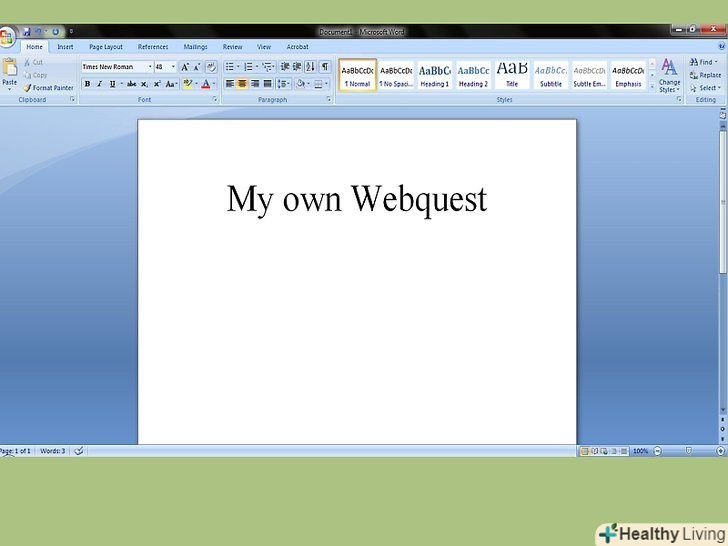 Зробіть титульну сторінку. ви можете вибрати будь-який, зручний вам існуючий формат (вебсайт, презентація Power Point, текстовий файл Google Doc, текстовий файл Word Doc, роздруківки і т.д.). Але при виборі будь-якого формату у вас обов'язково повинна бути Титульна сторінка. Вона задає тон всьому завданню і створює вашій роботі професійний імідж. Титульна сторінка повинна містити назву квесту і ваше ім'я. Обов'язково придумайте своєму вебквесту цікаву назву! [1]