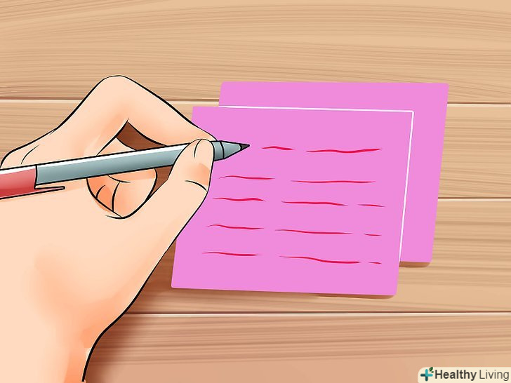 При заучуванні слів використовуйте картки.записуйте на одній стороні картки іноземне слово, а на другій-його російський переклад. Для цього зручно використовувати розрізані навпіл каталожні картки. Не обов'язково, щоб вони були великими, аби містилося кілька слів або фраза.[4]- Щоб краще запам'ятати значення іноземного слова, можна робити малюнки. Наприклад, якщо ви намагаєтеся вивчити німецьке слово "die Gabel" (вилка), можна намалювати на зворотному боці картки вилку, що дозволить швидше засвоїти значення цього слова.